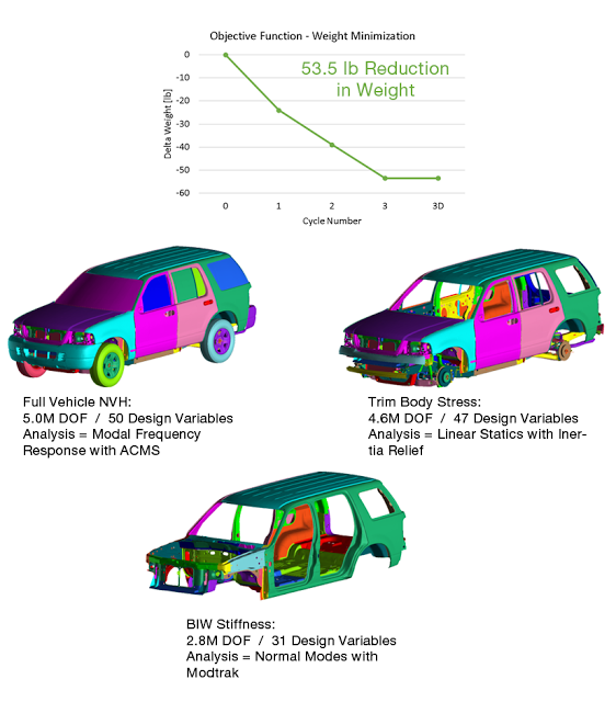 | Multi Model Optimization of a Sports Utility Vehicle. Simultaneous optimization is performed for NVH, Linear Static, and Normal Modes. |
