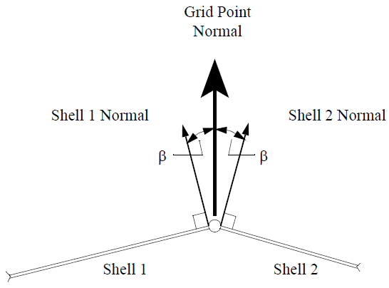 Shell normals are available for CQUAD4, CQUADR, CTRIA3, and CTRIAR elements. Normals are activated if the actual angle between the local element normal and the unique grid point normal is less than , the default value for β (see Figure 9-6.) The default β for can be changed by setting PARAM,SNORM, β to the desired real value up to 89 degrees. The unique grid point normal is the average of all local shell element normals at a specific grid point. Generated grid point normals may be overwritten by user-defined normals.
