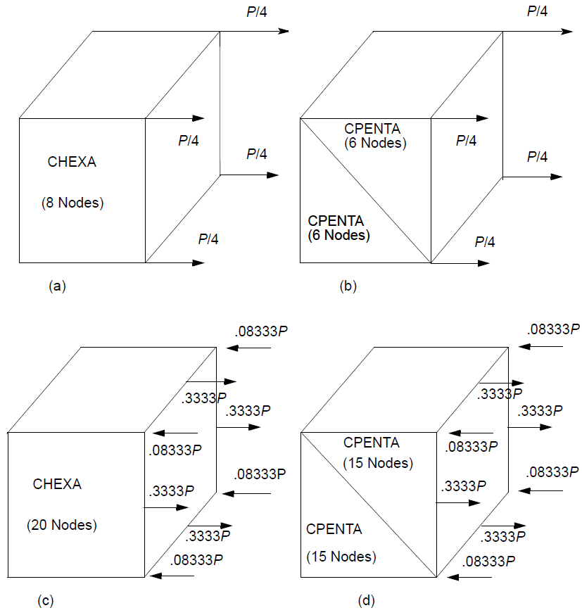 Consider another example with solid elements. A load P is to be applied evenly as an outward pressure load (P/A) to a surface of each of the four solid elements shown in Figure 9-28. Again, if you lump these loads equally to the grid points, the lumped load at each node is P/4 for the CHEXA (with eight nodes) and CPENTA (with six nodes), and P/8 for the CHEXA (with 20 nodes) and CPENTA (with 15 nodes). The consistent loads are shown in Figure 9-28. The consistent and lumped loads are the same for the CHEXA (with eight nodes) and the CPENTA (with six nodes) for this case. The consistent loads for the CHEXA (with 20 nodes) and CPENTA (with 15 nodes) are shown in Figure 9-28(c) and Figure 9-28(d), respectively. The load distribution along each edge is -.0833P, .3333P and -.08333P, or a -1/4/-1 ratio, which is quite counter intuitive, especially for the sign change. Fortunately, you do not have to calculate this consistent load for the pressure load. This consistent load is generated automatically inside MSC Nastran by using the PLOAD4 entry.