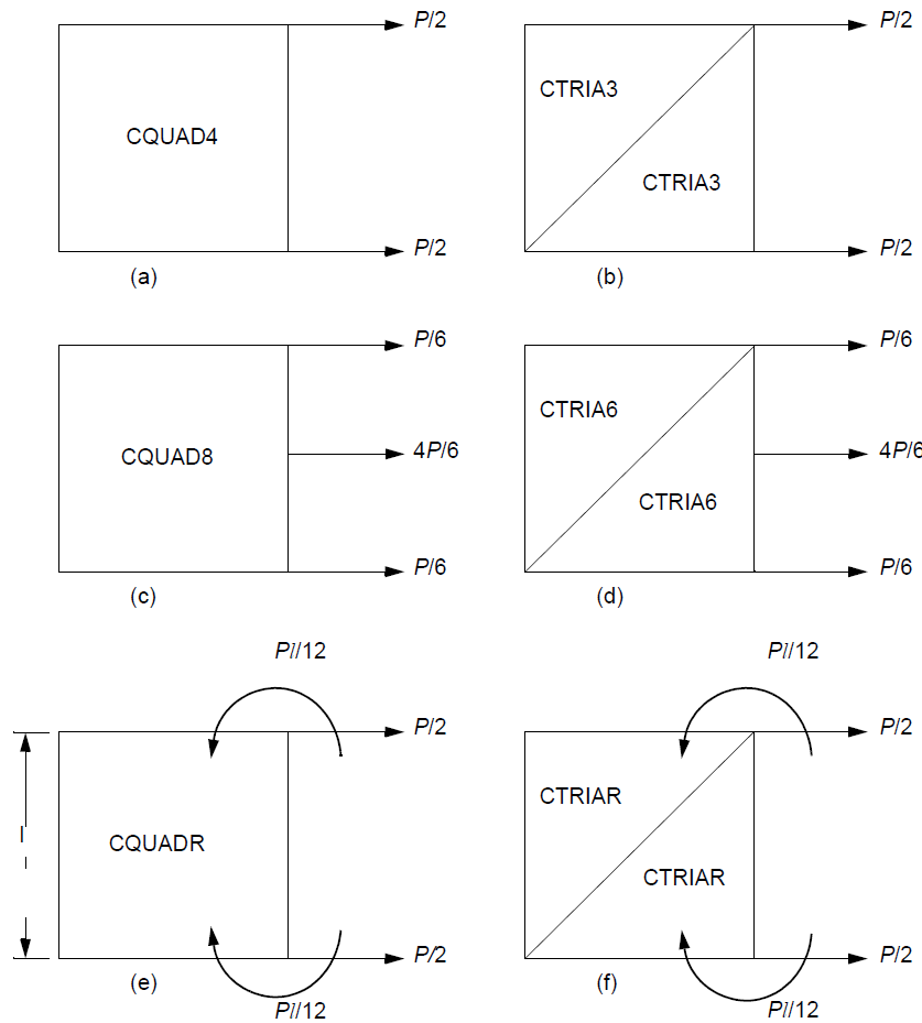 The equivalent loads at the grid points computed from the element loads are known as consistent loads, and they are calculated by applying the principle of virtual work. The same shape function that is used in deriving the element stiffness is used for arriving at this load-and hence the word consistent load. They are a function of the element types and the applied loads. Depending on the element, these lumped loads in general are not equal to the consistent loads. The consistent loads for each of these elements for a uniform in-plane edge load of P/l are shown next to each element. In this case, the lumped loads and consistent loads are the same for the CQUAD4 and CTRIA3. They are not the same for the CQUAD8, CTRIA6, CQUADR and CTRIAR. As you can see, they are substantially different from the lumped loads that were discussed in the previous paragraph. It is interesting to note that the loads are distributed as 1/6, 4/6, and 1/6 along the edge for the CQUAD8 and CTRIA6, which is quite different from the lumped load approach. For the CQUADR and CTRIAR, an additional moment Pl/12 is needed to arrive at the consistent loads. When the corresponding consistent loads shown in Figure 9-27 are applied to each of the respective elements, the force distributions are then equivalent for all the elements.