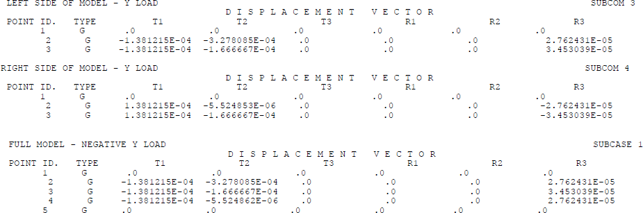 The fourth subcase is also a “results combination” subcase. It produces results for the portion of the structure that you did not model (the right-hand side of the frame in this case). These results are achieved by substracting 100% of the results of the second subcase from 100% of the results from the first subcase. As in Subcase 3, the SUBCOM command instead of the SUBCASE command is used in this case. Once again, no load or boundary condition is needed for this subcase; this is an optional subcase. It is not required if you do not want to obtain results for the other half of the structure that you did not model.