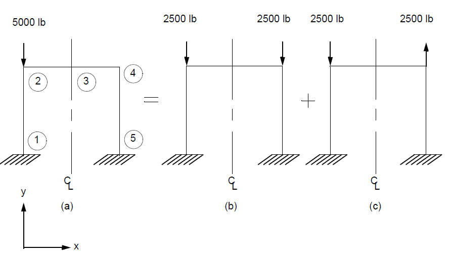 This feature is activated by Case Control commands. The above frame example is used to illustrate the required Case Control commands. Listing 9-1 contains the input file for this problem. (See Install_dir/mscxxxx/doc/linstat/symbar.dat)