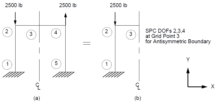 No special user interaction is required in the Executive Control Section or Bulk Data Section. Depending on the number of planes of symmetry, approximately one-half or less of the structure needs to be modeled. For the above frame model, only one-half of the model needs to be analyzed.